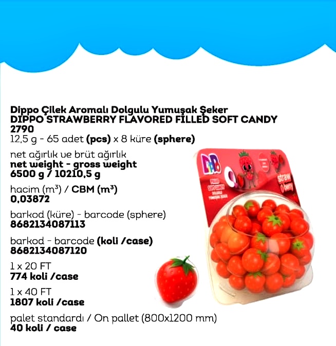 DİPPO DOLGULU YUMUŞAK ŞEKER ÇİLEK (ADET FİYATI 9.5 TL'DİR. KÜRE İÇİ 65 ADETTİR.)