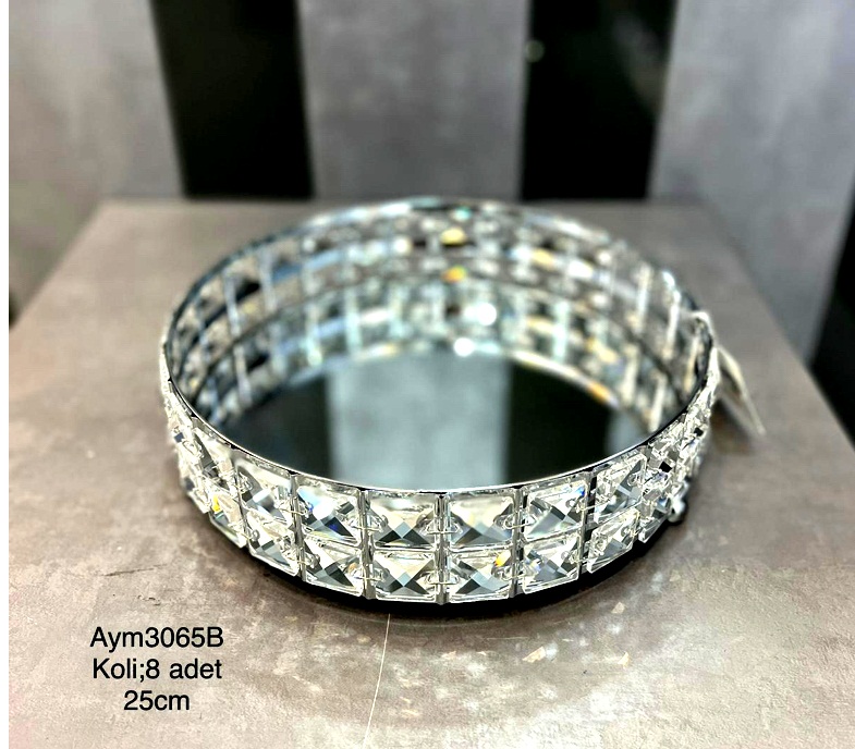 BZ-JX21G - GÜMÜŞ ÇİÇEK KRİSTAL TAŞLI YUVARLAK AYNALI TEPSİ 30 CM KÜÇÜK BOY
