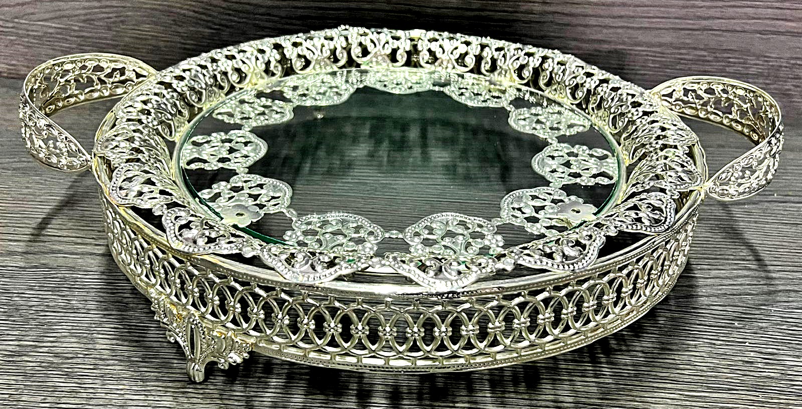 BKZ 4022-G LEYLAK PIRLANTA TAŞLI YUVARLAK AYNALI TEPSİ 36,5x27x5 cm GÜMÜŞ