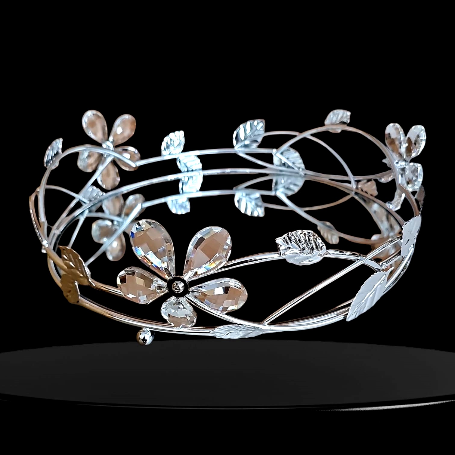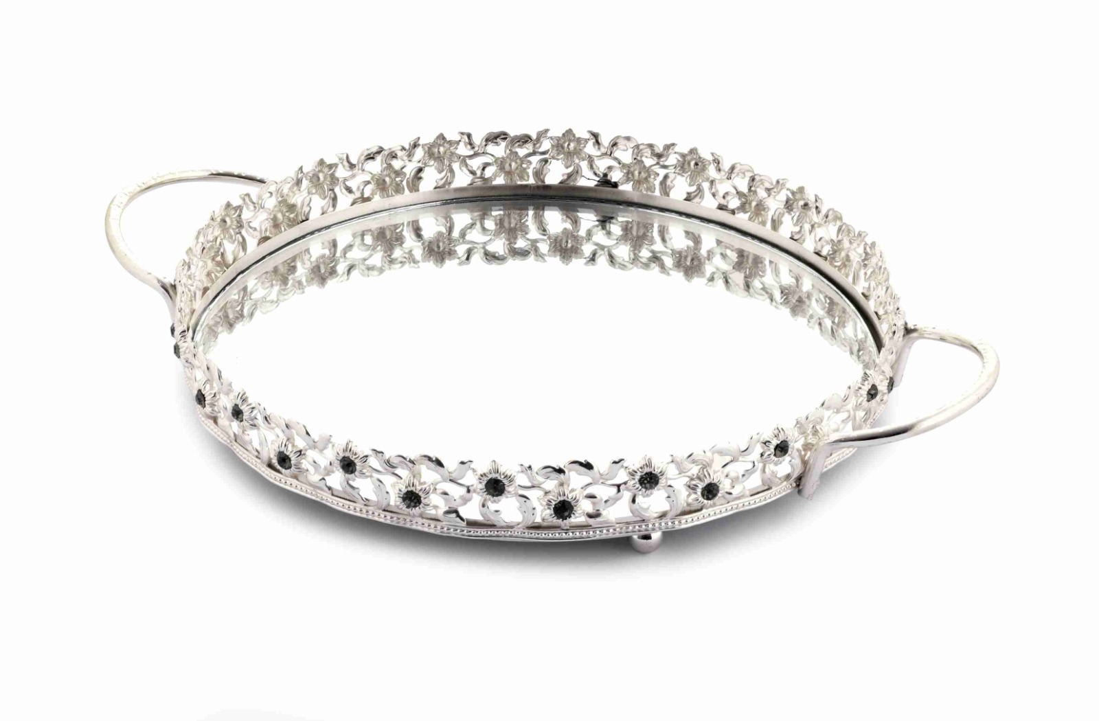 BZ-JX21G - GÜMÜŞ ÇİÇEK KRİSTAL TAŞLI YUVARLAK AYNALI TEPSİ 40 CM BÜYÜK BOY