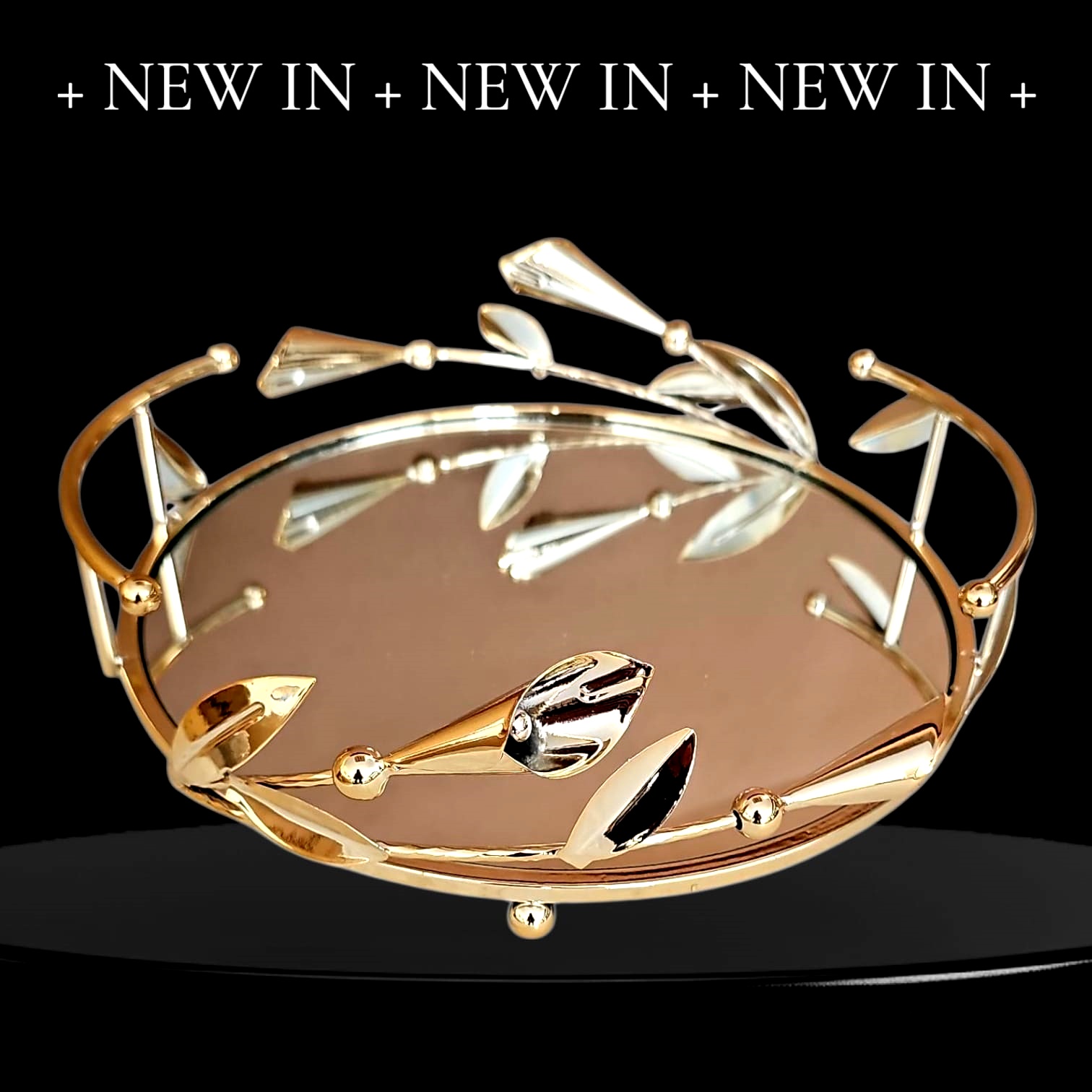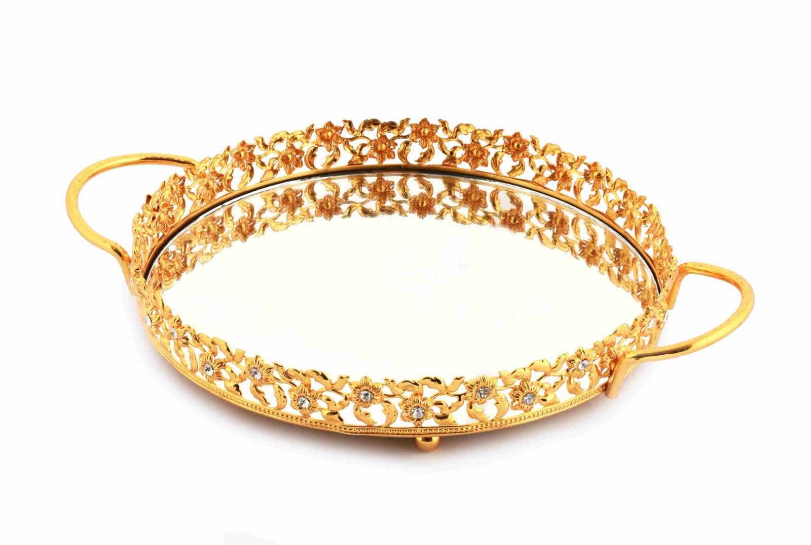 BZ-JX21A - ALTIN ÇİÇEK KRİSTAL TAŞLI YUVARLAK AYNALI TEPSİ 30 CM KÜÇÜK BOY