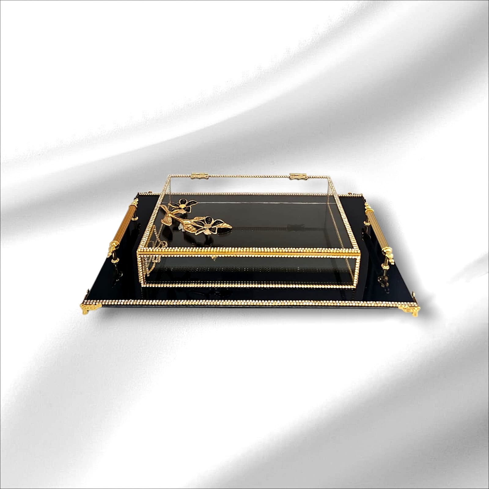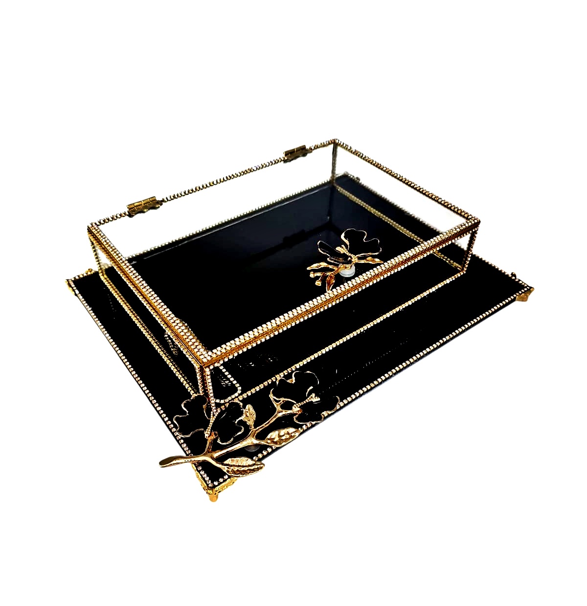 KDD SİYAH CAM, ZEYTİN DALI MİNE ÇALIŞMASI , DİKDÖRTGEN AYAKLI SUNUMLUK+CAM KUTU - 4095