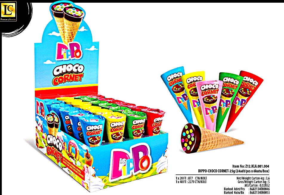 DİPPO CHOCO BONİBONLU SÜPER KORNET (ADET FİYATI 10 TL. KUTU İÇİ 24'LÜDÜR)