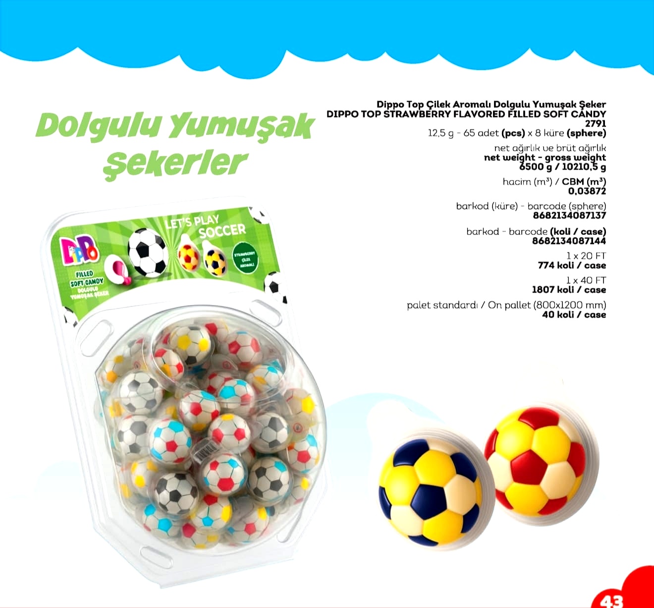 DİPPO DOLGULU YUMUŞAK ŞEKER FUTBOL TOPU (ADET FİYATI 9.5 TL'DİR. KÜRE İÇİ 65 ADETTİR.)