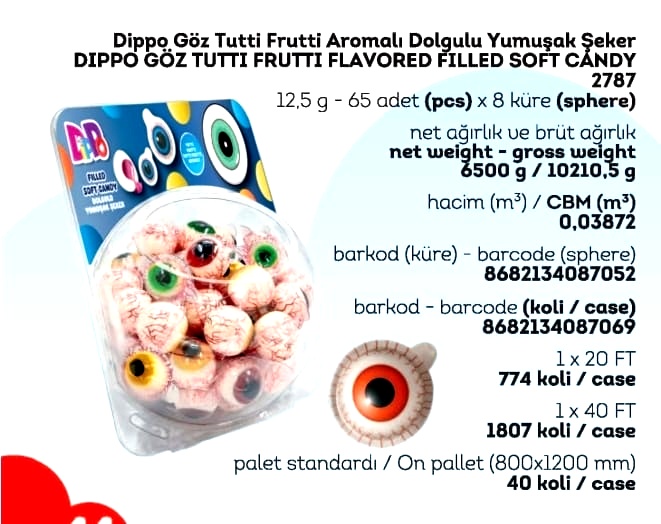 DİPPO DOLGULU YUMUŞAK ŞEKER GÖZ (ADET FİYATI 9.5 TL'DİR. KÜRE İÇİ 65 ADETTİR.)