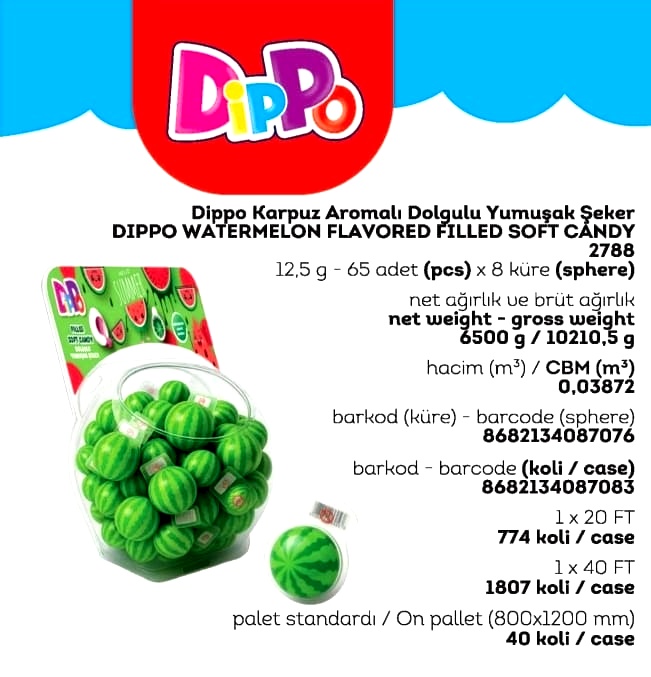 DİPPO DOLGULU YUMUŞAK ŞEKER KARPUZ (ADET FİYATI 9.5 TL'DİR. KÜRE İÇİ 65 ADETTİR.)