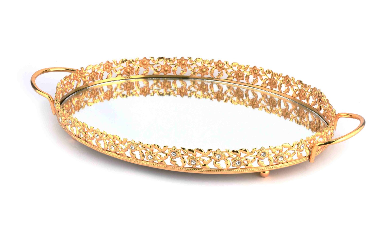 BZ-JX21A - ALTIN ÇİÇEK KRİSTAL TAŞLI YUVARLAK AYNALI TEPSİ 40 CM BÜYÜK BOY