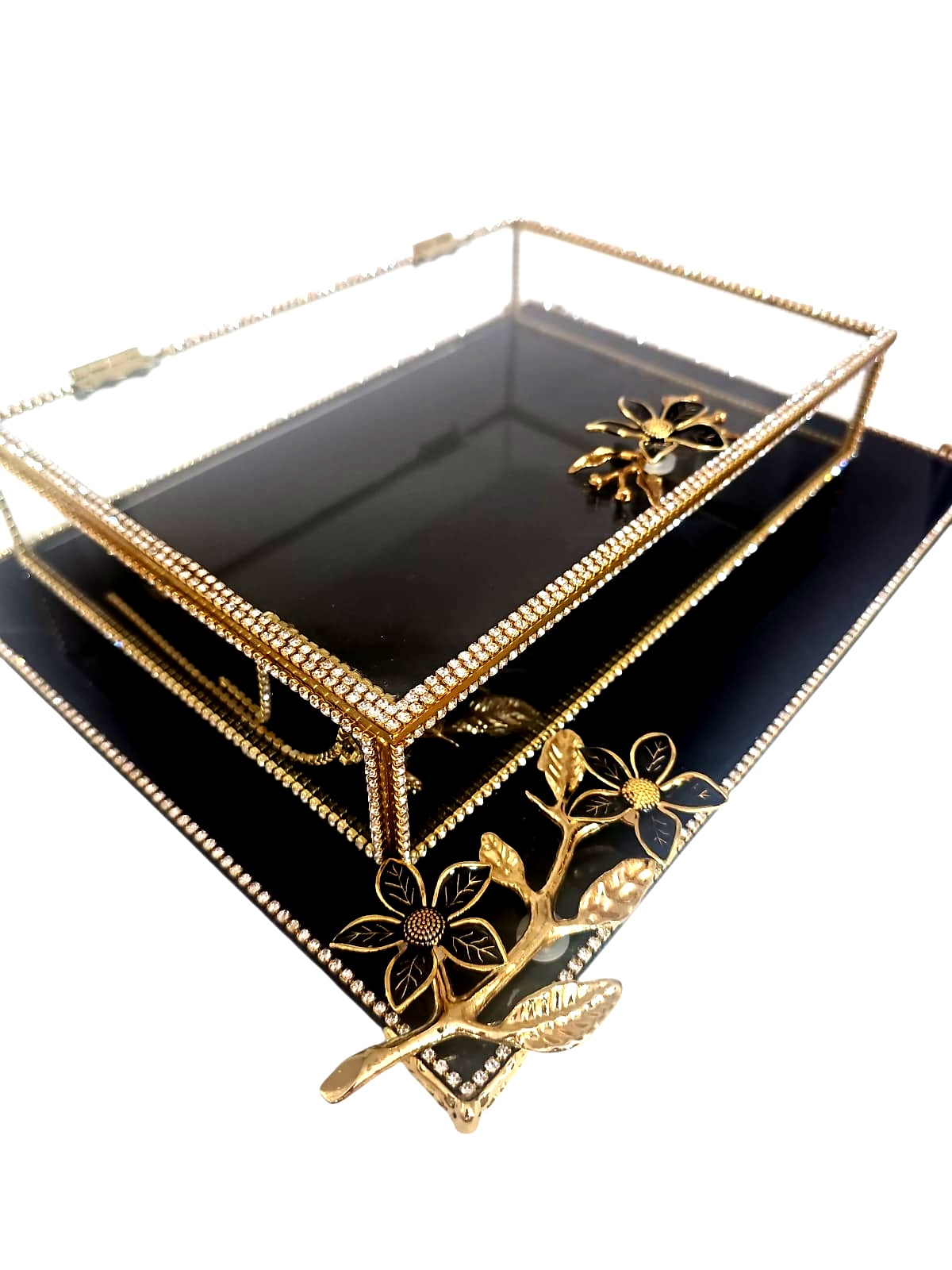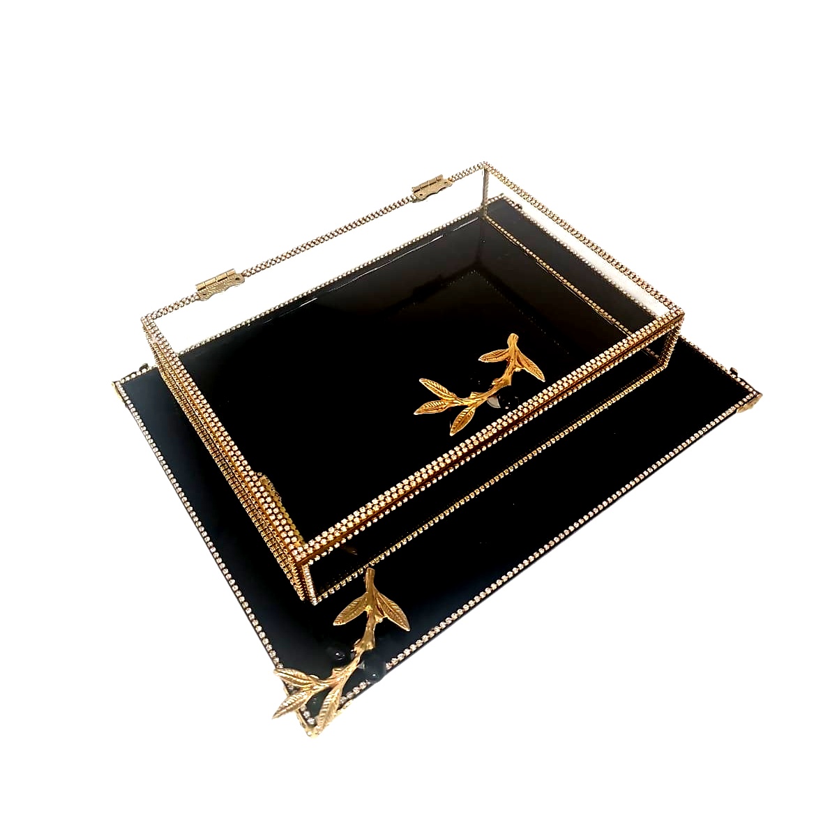 KDD SİYAH CAM, ZEYTİN DALI MİNE ÇALIŞMASI , DİKDÖRTGEN AYAKLI SUNUMLUK+CAM KUTU - 4095